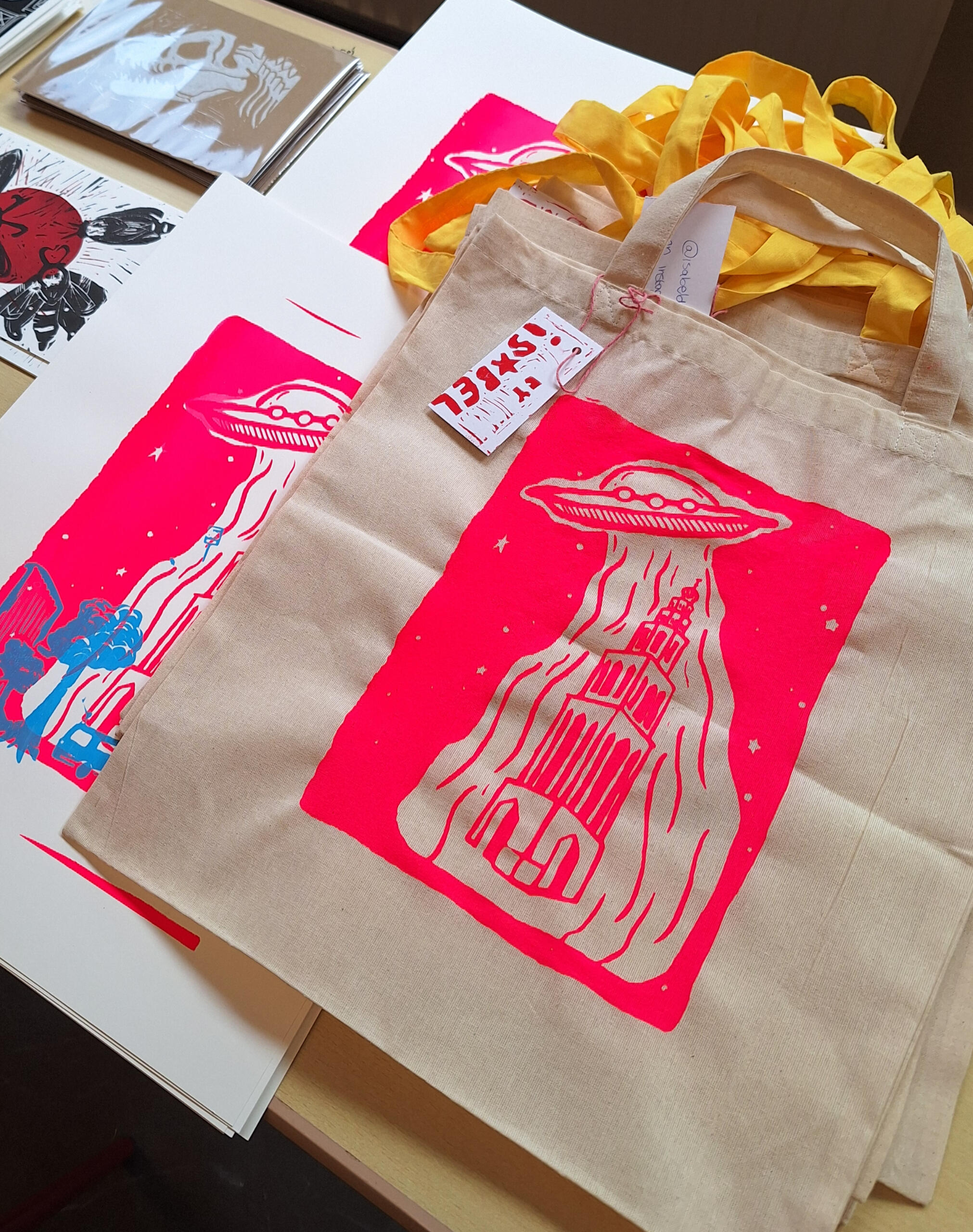 The Martini-Abduction prints & tote bags were made for Groningen's 2024 pride event in June. Groningen is a city with many international students, and its especially packed with people from other places during pride. I wanted to make something that serves as a fun memory for these people.The prints and tote bags were both made at Noorderpoort, hence the yellow straps and logos on some of the bags. It displays the 'Martinitoren' being abducted by an unidentified flying object. Several of these prints have an additional sky-blue layer, this layer has some more specific details based on the area around the tower!