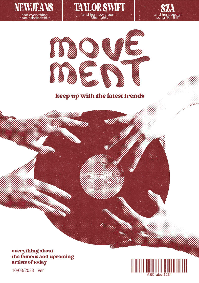 This gave everyone a chance to talk about someone they enjoy.The title Movement represents going with the flow of the current music generation. It is seen on the cover of the magazine page in a playful and fluid typography. The logo and full cover for our group project were made by me. A vinyl record is seen in the middle of the cover, this picture was made by us in a mini photoshoot. Vinyls have been becoming very popular again in recent years, so it felt relevant to use it for the cover. On top of the page there's a hint on what to expect in the magazine.For the design we went with one primary color for everyone, with white as the supporting color. We all chose our colors, and I ended up with sky-blue, and a darker yellow. I made 2 spreads for LE SSERAFIM and NewJeans, two new and upcoming artists I'm interested in.