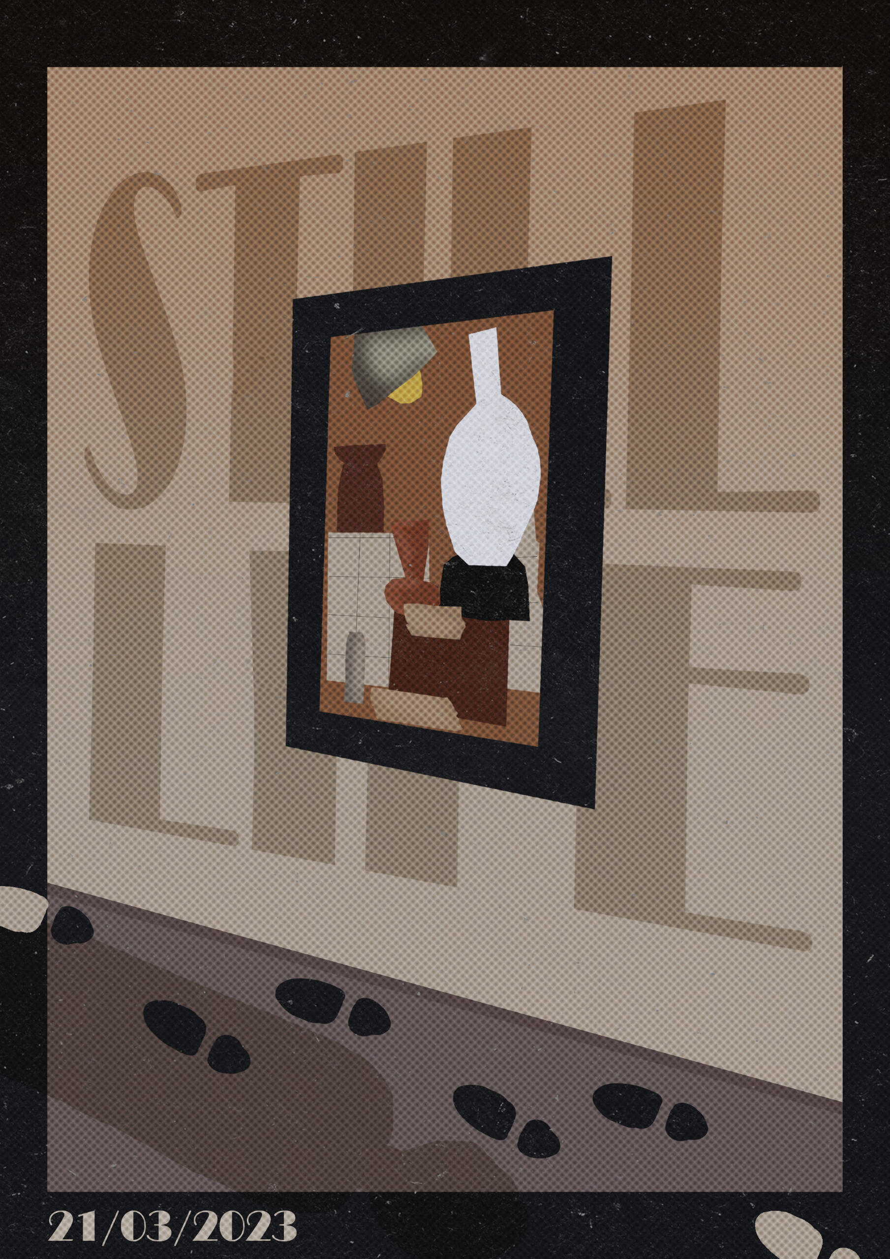 This is a poster I made in a workshop about "still life". It depicts an artwort of several vases and a lamp in a museum hallway. Someone just quietly passed by it, only leaving a trail of footsteps behind.
