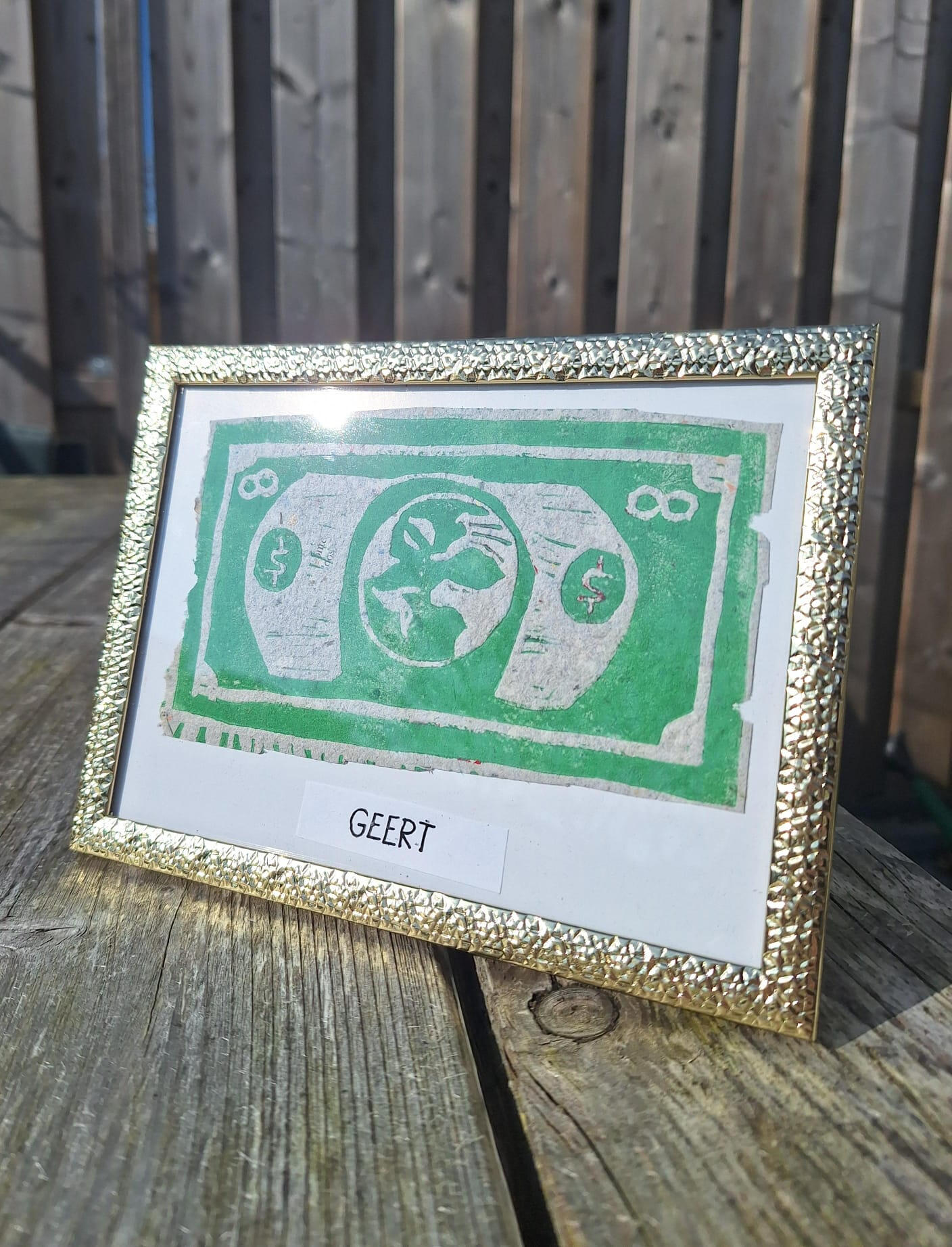 I collected every newspaper I could find at home with his face (and political figures with similar views) and blended them to a pulp. With this pulp i made one piece of paper.The lino print represents a dollar bill of our earth. There's only one of these prints, because we only have one earth.