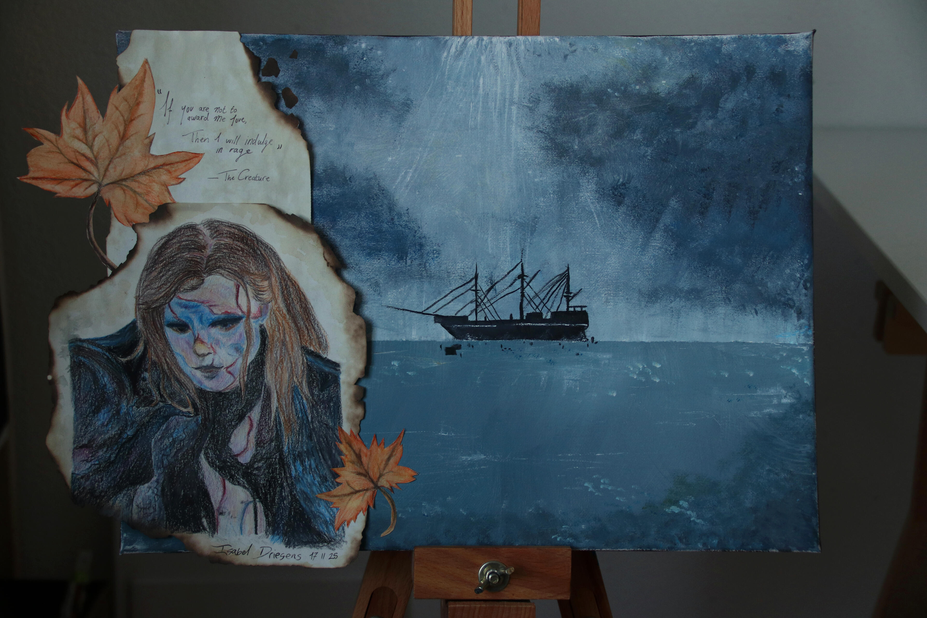 Acrylic paint on canvas & Watercolor pencils on paperA collage inspired by Guillermo Del Torro's Frankenstein. It shows a scene of the 'Creature' arriving at the