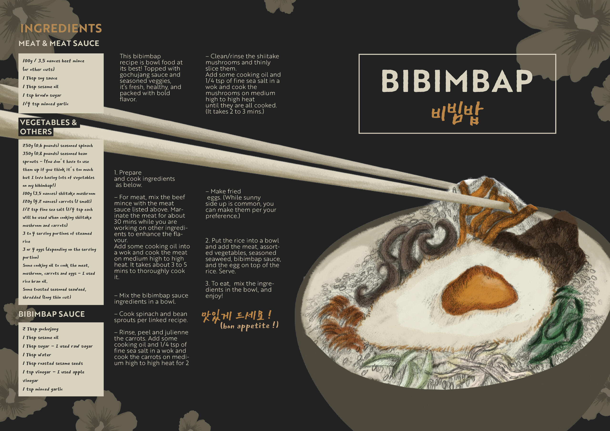 Pages for a recipe in a Korean-cookbook. The bibimbap dish is made by combining pencil drawings with overlays in photoshop. The flowers in the background are traditional Korean Mugunghwa flowers, the flower is said to represent Korea.